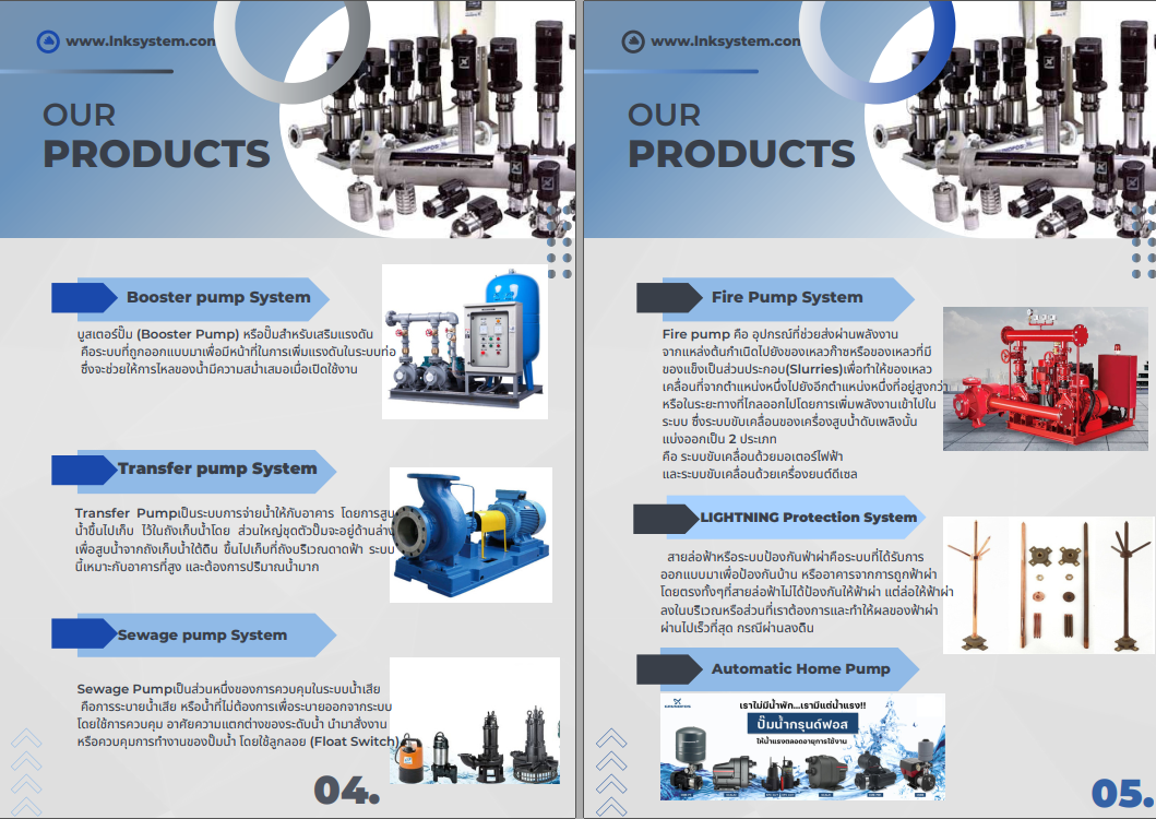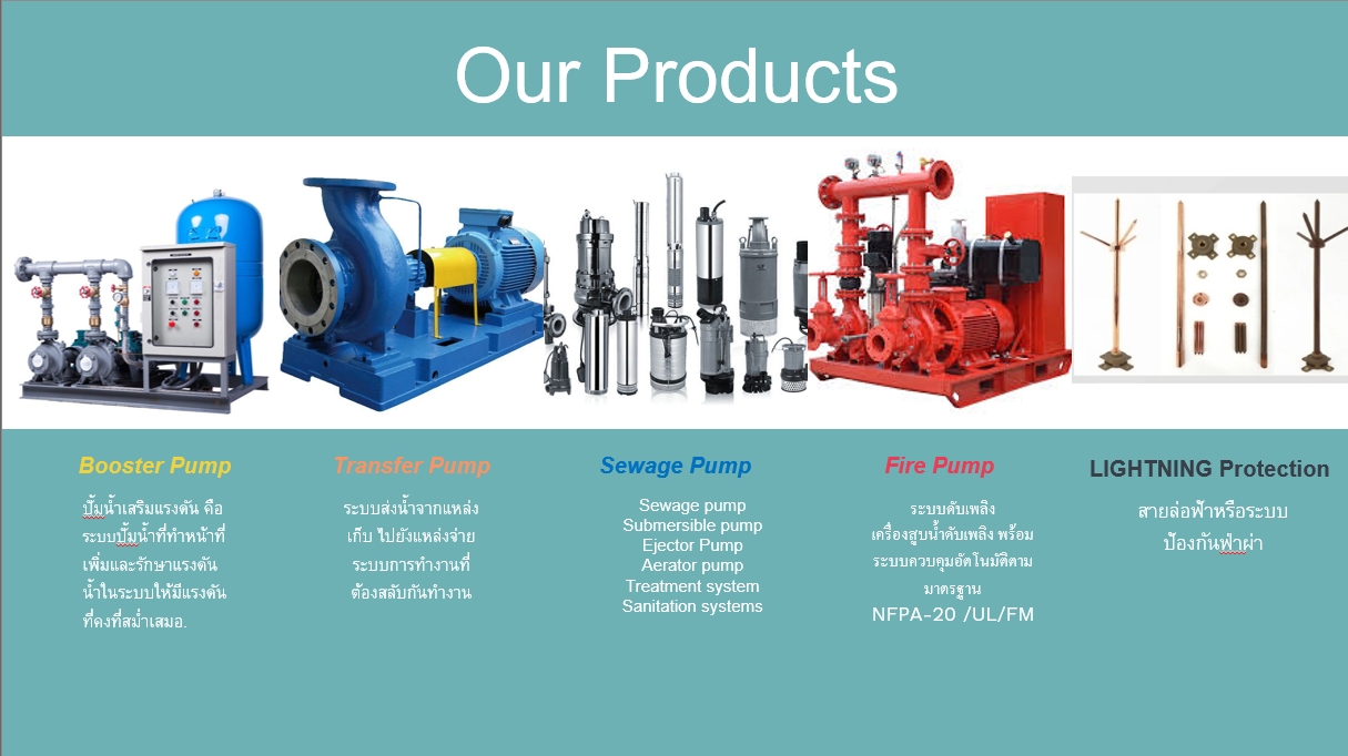 จำหน่ายสินค้าและบริการเกี่ยวกับงานระบบประปา ระบบไฟฟ้า ระบบดับเพลิง งานติดตั้งรับเหมา งานสุขาภิบาลงานหัวล่อฟ้างานปั๊มเกษตร